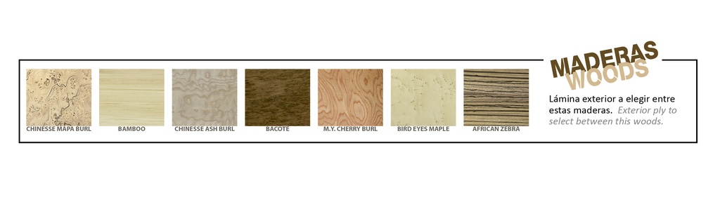 Maple shell and hoops. Exterior ply select between Chinesse mapa burl,Bamboo, Chinesse ash burl, Bacote, M.Y. Cherry burl, Roble or African zebra. Remo heads. Select finishe in the colour chart.