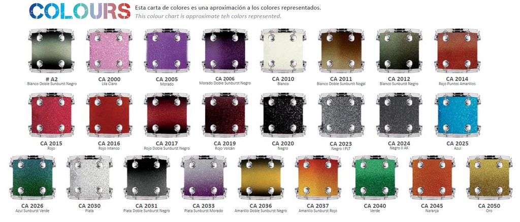 Maple shell and metal hoops. Remo heads. Select finished in the colour chart.