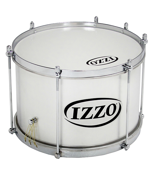 Cajas de aluminio con parches blancos P3 de 250 micras. 6 puntos de tensión. Herrajes cromados. Sirve la funda código 6939. Peso: 3,25Kg. Izzo Percussion.